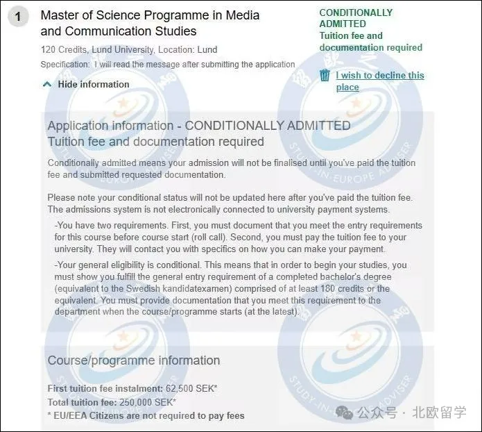 北京大学信息管理专业,学士学位,被隆德大学信息系统专业硕士课程录取,学制1年