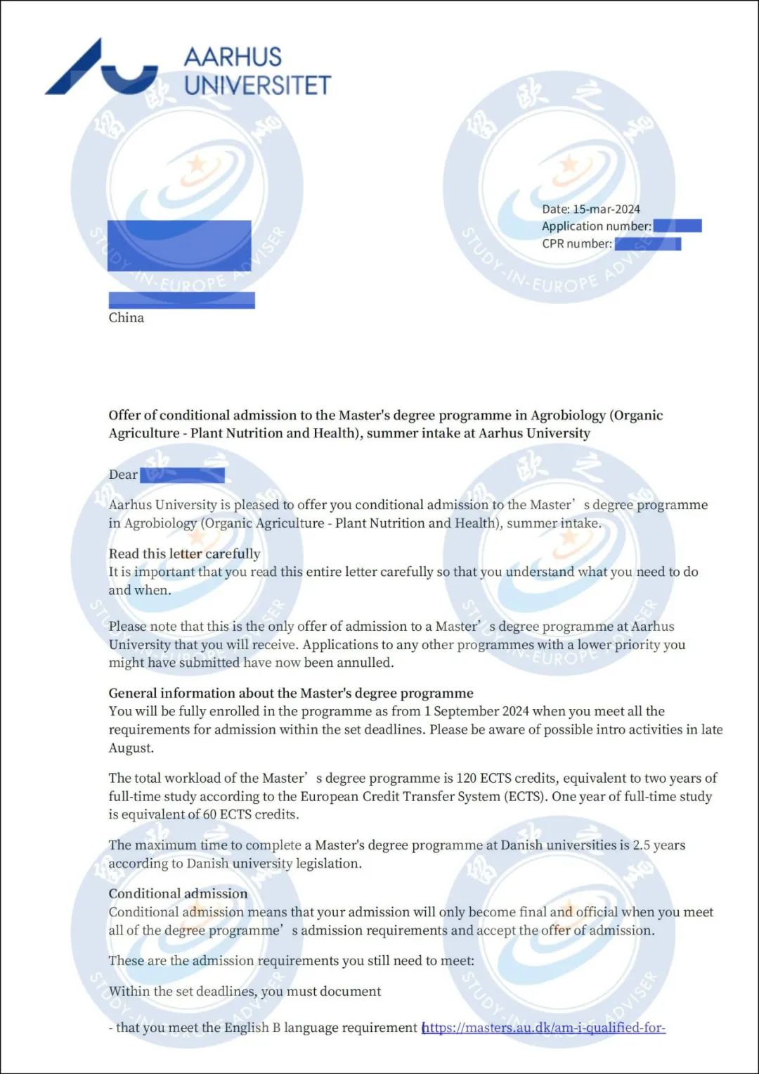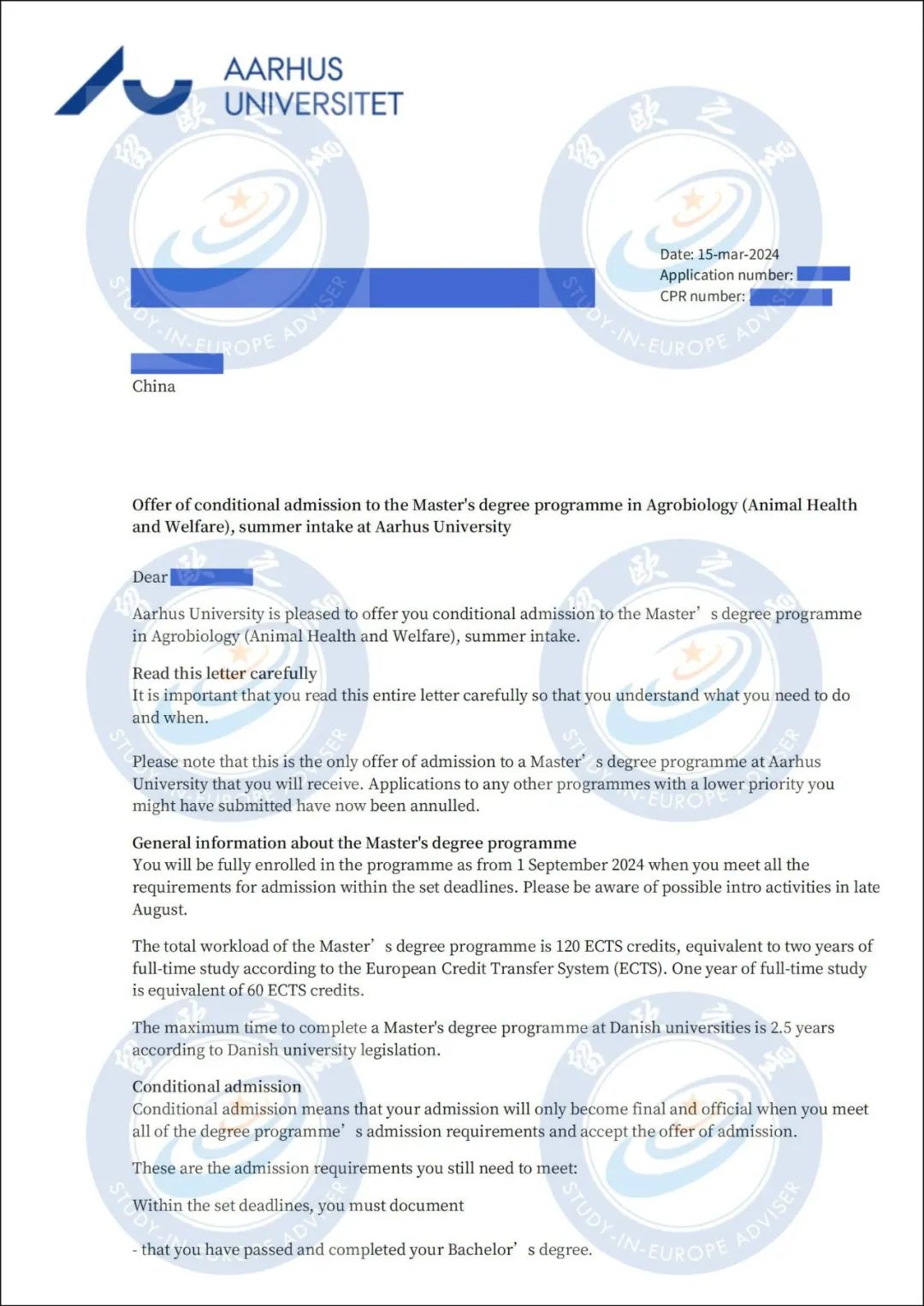 学生背景:西南大学,动物科学专业;录取院校与专业:丹麦奥尔胡斯大学(农业生物学硕士--动物健康与福利方向);